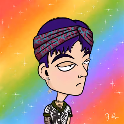Collection Depressed Citizens Artist Juls Description ART. No team, no project, no future. Depressed Citizens is an urban & existential Art expression on Ordinals. In a parallel universe, "THEI" control us. DC unites against toxic society, encouraging critical thinking. 100% hand made collection that took Juls more than 6 months of daily work. Name Citizen#152 Origin LGBT-Q+ Gender Non-binary Necklace Gold layered necklace Hat Printed headband Mustache Beard No beard Glasses No Glasses Earrings Upper lobe rings Hair Style Short pixie Clothes Boardriders shirt Tattoo Maya tattoo Star Background With stars